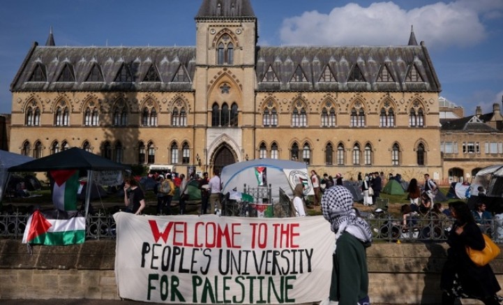 Oxford Üniversitesinin Pitt Rivers Müzesi önündeki alanda 6 Mayıs'ta çadırlar kuran öğrenciler, üniversitenin silah şirketleri ve Barclays Bankası ile olan işbirliklerini protesto ediyor.